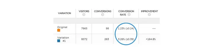 Here, the results show that there’s a 95% chance that the conversion rate for a variant will fall at 3.26% (give or take 0.39), and the original conversion rates fall at 1.23% (give or take 0.24).