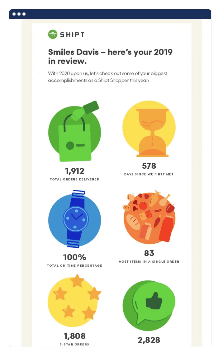 For example, Shipt reflects on the customer’s “biggest accomplishments” in the email below. The stats make the reader feel proud of the work they’ve done in the past year, and make them feel a part of a bigger community. These strategies paid off, since Shipt indicated this email was “forwarded to 471 people and had 231 prints.”
