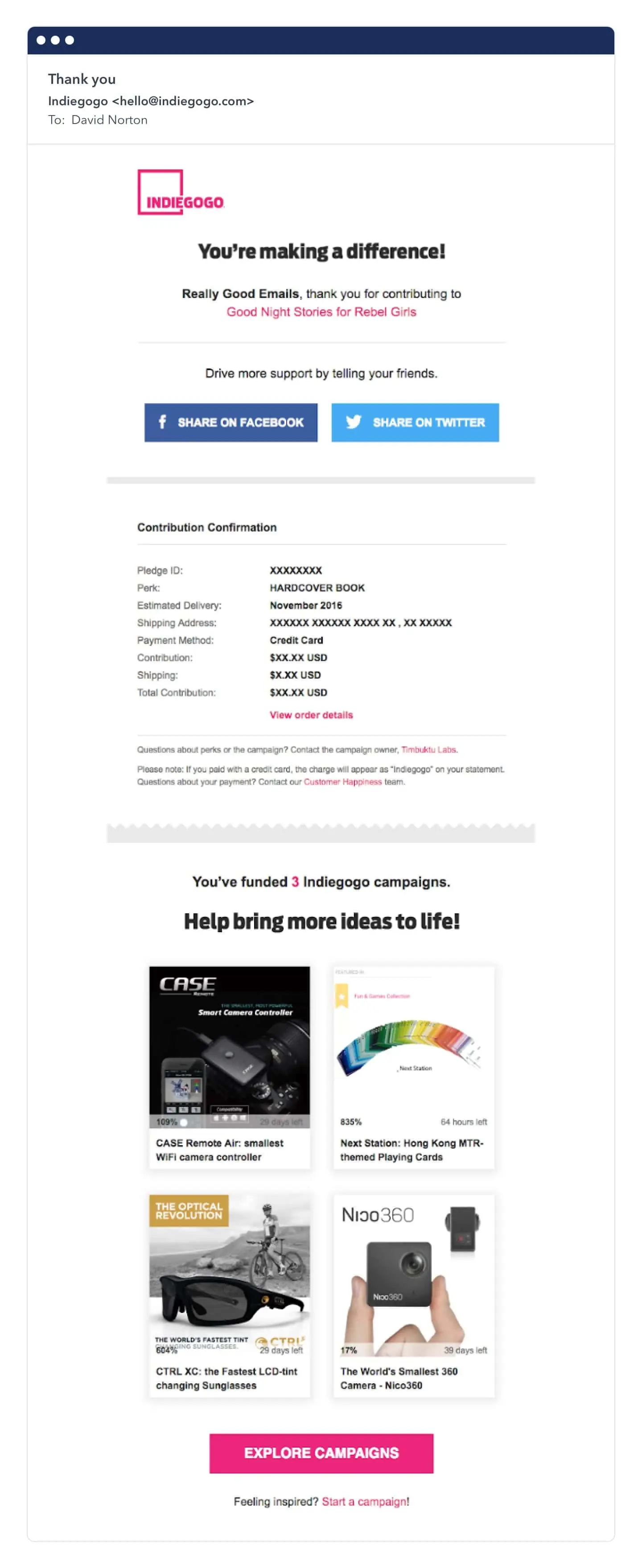 In this example from Indiegogo, the customer is shown other funding campaigns related to the users’ interests. When done well, this can be an opportunity to use behavioural targeting to drive the customer journey.