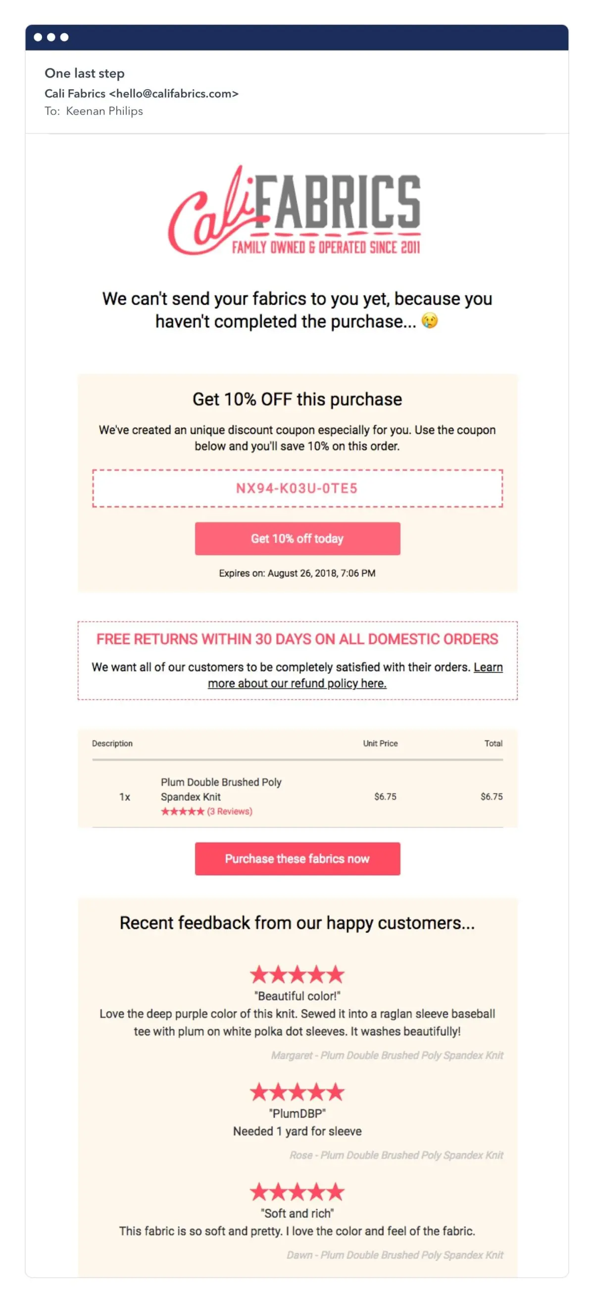Cali Fabrics sent one of their customers a 10% off discount code for the items that they left in their cart and didn’t complete purchasing.