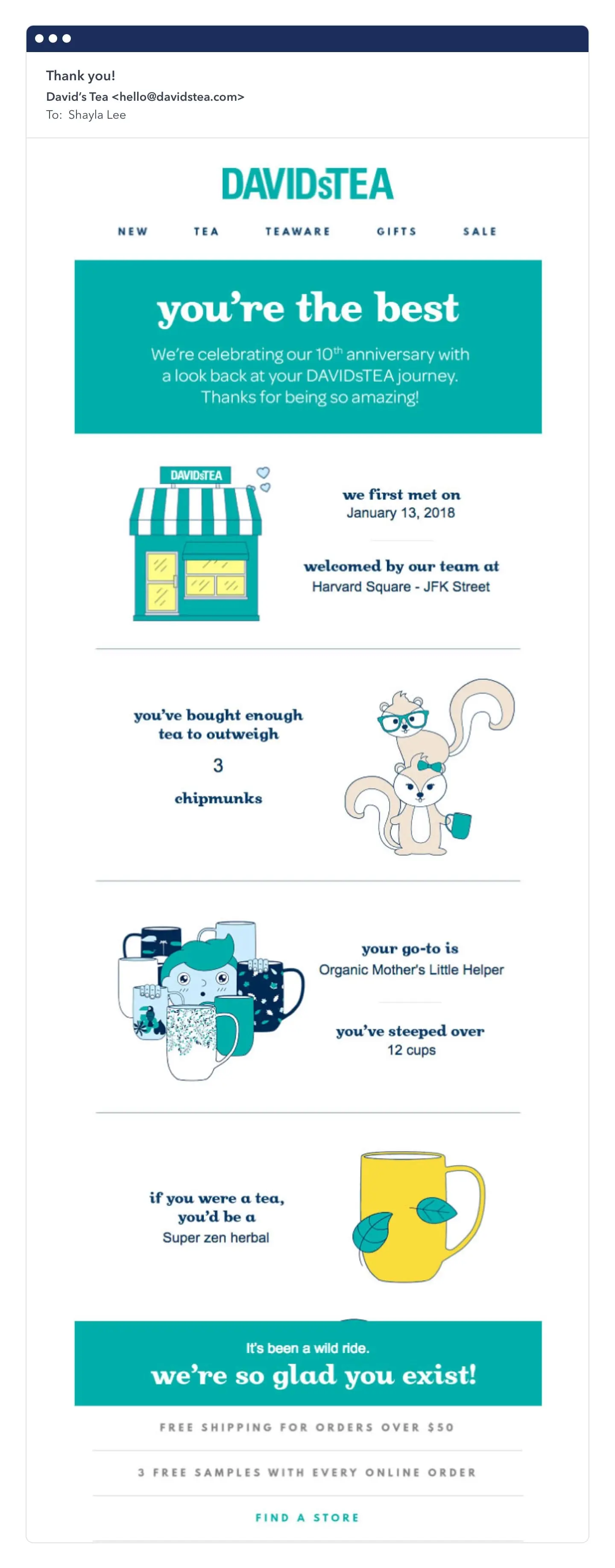 Most brands keep this sort of message super simple. First and foremost, they confirm and thank the customer for the purchase. Though sometimes, there is an opportunity to use the transactional email to keep the conversation going.