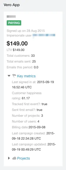 This little sidebar tells us a lot. It tells us whether the customer is paying, when they last interacted with Vero, how engaged they are (that’s our homegrown Customer Happiness Index – above 60 is good), how much they’re paying, when they paid, email campaign activity and so on.