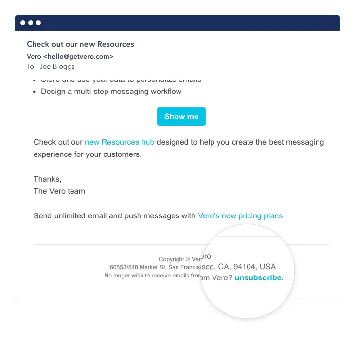At the footer of all your marketing emails, there must be a very clear way for users to quickly unsubscribe from your marketing messages.