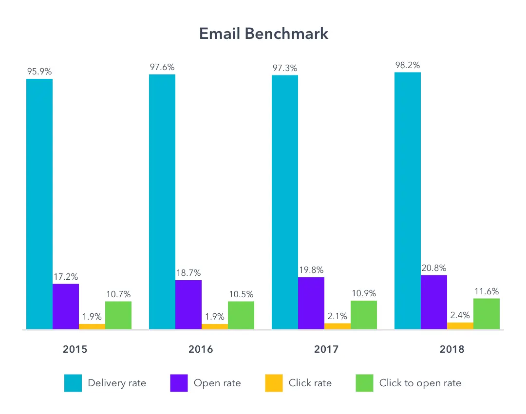 You shouldn’t be too worried if your CTR figures are low as this is usually the case in email marketing. Here’s a graph that shows the average email CTRs across industries from 2015 to 2018 shows why: