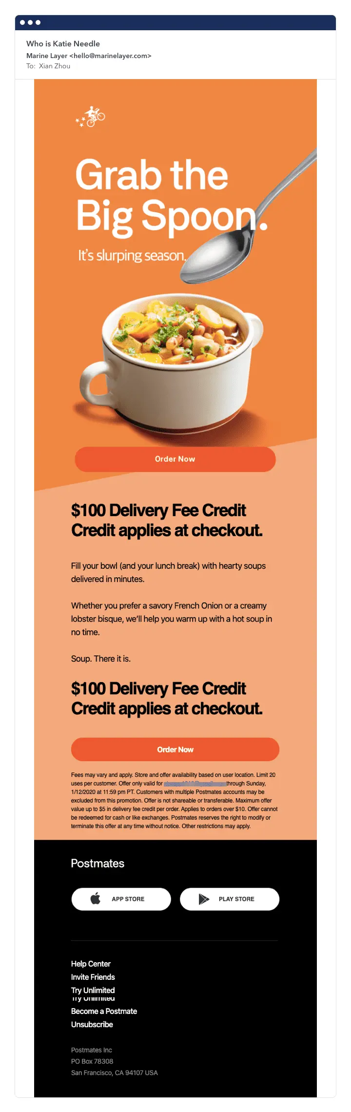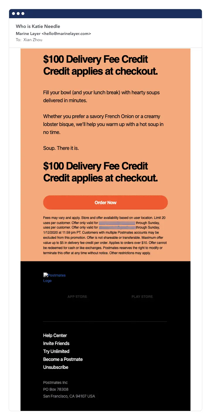The below email from Postmates is a great example of how images add to an email, but their absence doesn’t render the email useless. The first email is what appears when email images are turned off, and the second has images turned on.
