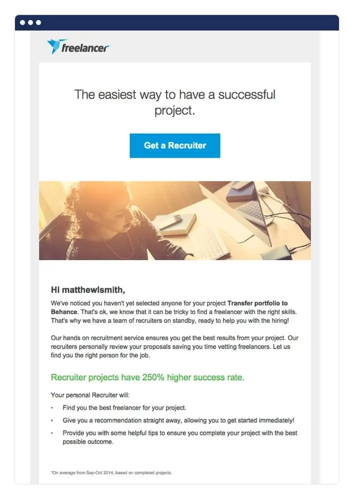 Freelancer uses a sticking point in the user process to present an upsell. The company recognizes that the user has set up a project, but hasn’t hired anyone yet. Since this could indicate the user is stuck, it’s the perfect time to present an upsell “recruiter” service.