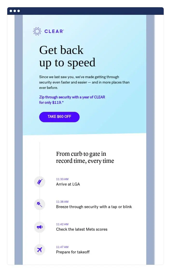 If time has passed since a user has engaged or had an account with you, it’s a good idea to get them up to speed on what they’ve missed. Clear’s winback email below addresses that they’ve made processes faster and easier.