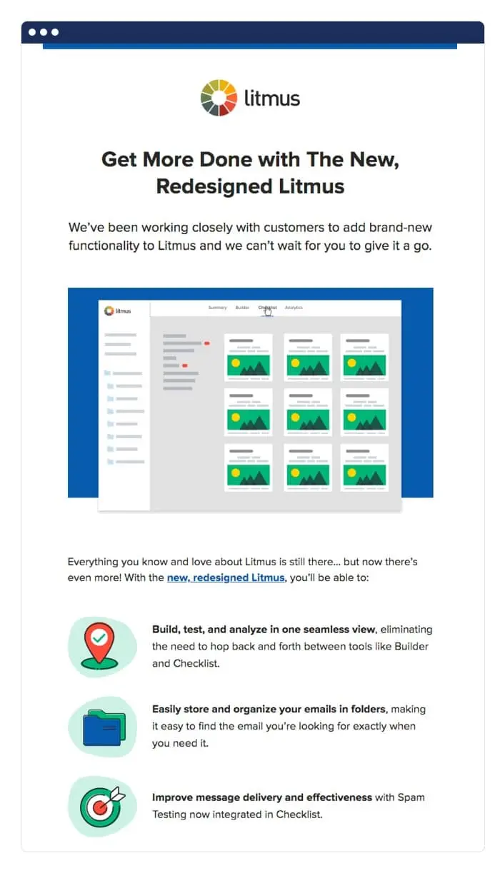 - Use benefits to drive action. Your tools and features make it possible for users to move forward, but they’re more focused on outcomes. How can you highlight benefits or results in your emails that inspire them to get started? For example, Litmus mentions the impact of each update in their customer’s workflow.