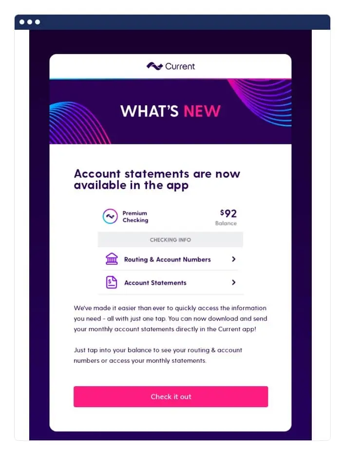 Short emails can carry smaller updates, like the one from Current below. The message has a simple description of the upgrade’s benefits, how it works, and what it looks like in the app. Then, there’s a bold CTA button to “check it out.”