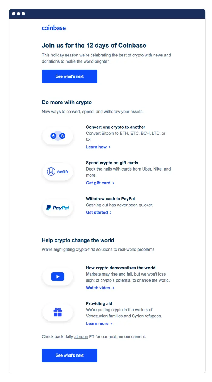 Coinbase also uses the holidays to send promotional emails. If offering discounts isn’t your style, you can pull a page from Coinbase’s playbook and highlight features or ways to give back.
