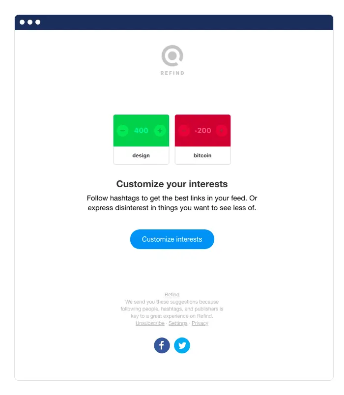 Refind uses a straightforward email to gauge what users are interested in. By prompting subscribers to choose hashtags to follow, the company can better serve them. You can also use this information to segment future content or promotional campaigns.