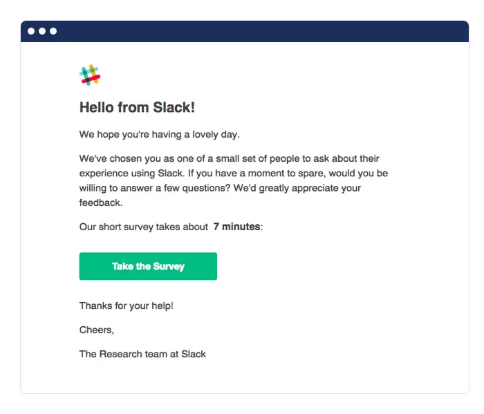 Sometimes, you need customer feedback that goes a little deeper. Slack sent an email to users asking them to complete a short survey. For these emails, it’s important to lay out why you’re asking for this information and to set expectations on how long it will take.