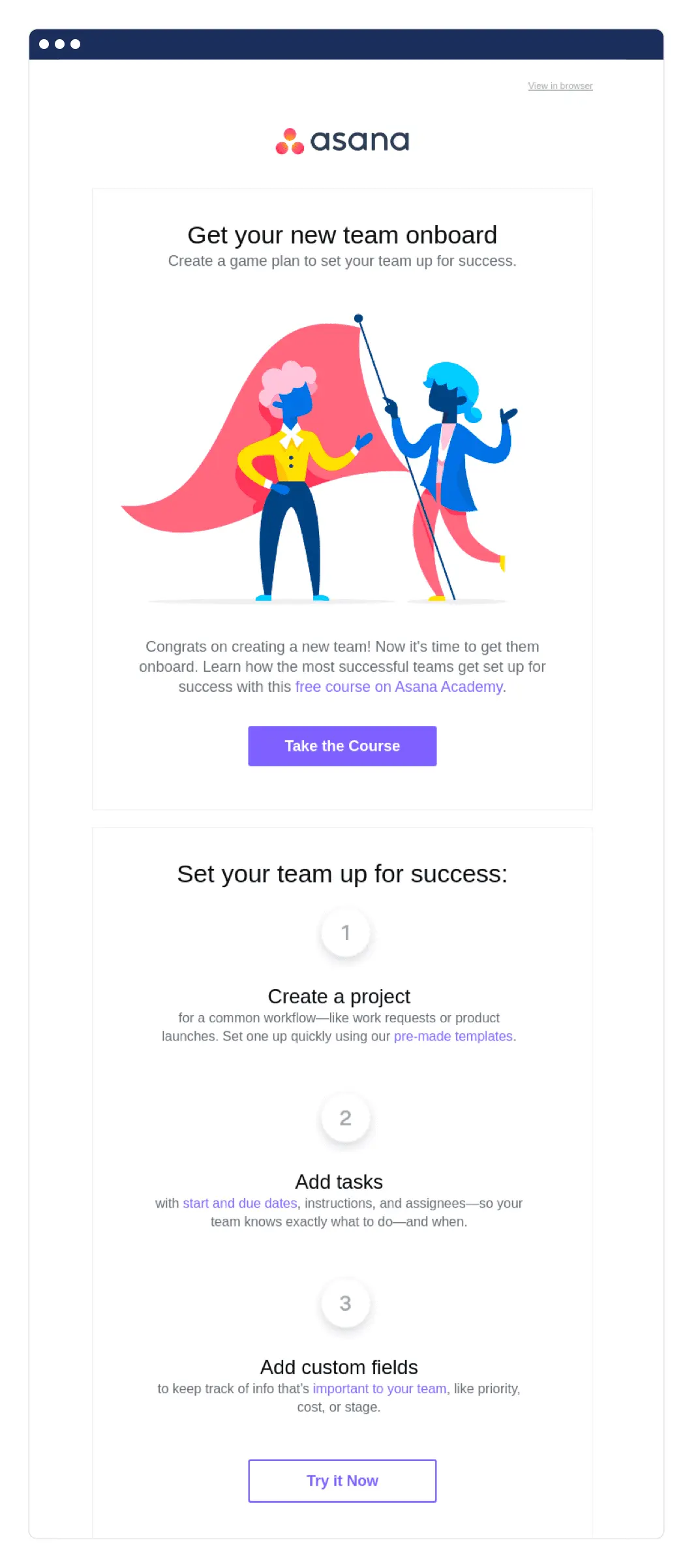 Asana acknowledges the actions already taken and points users to the next step. This onboarding email focuses on educating the person on how to bring their team members into the system. If they want the quick version, they can consult the three-step checklist.