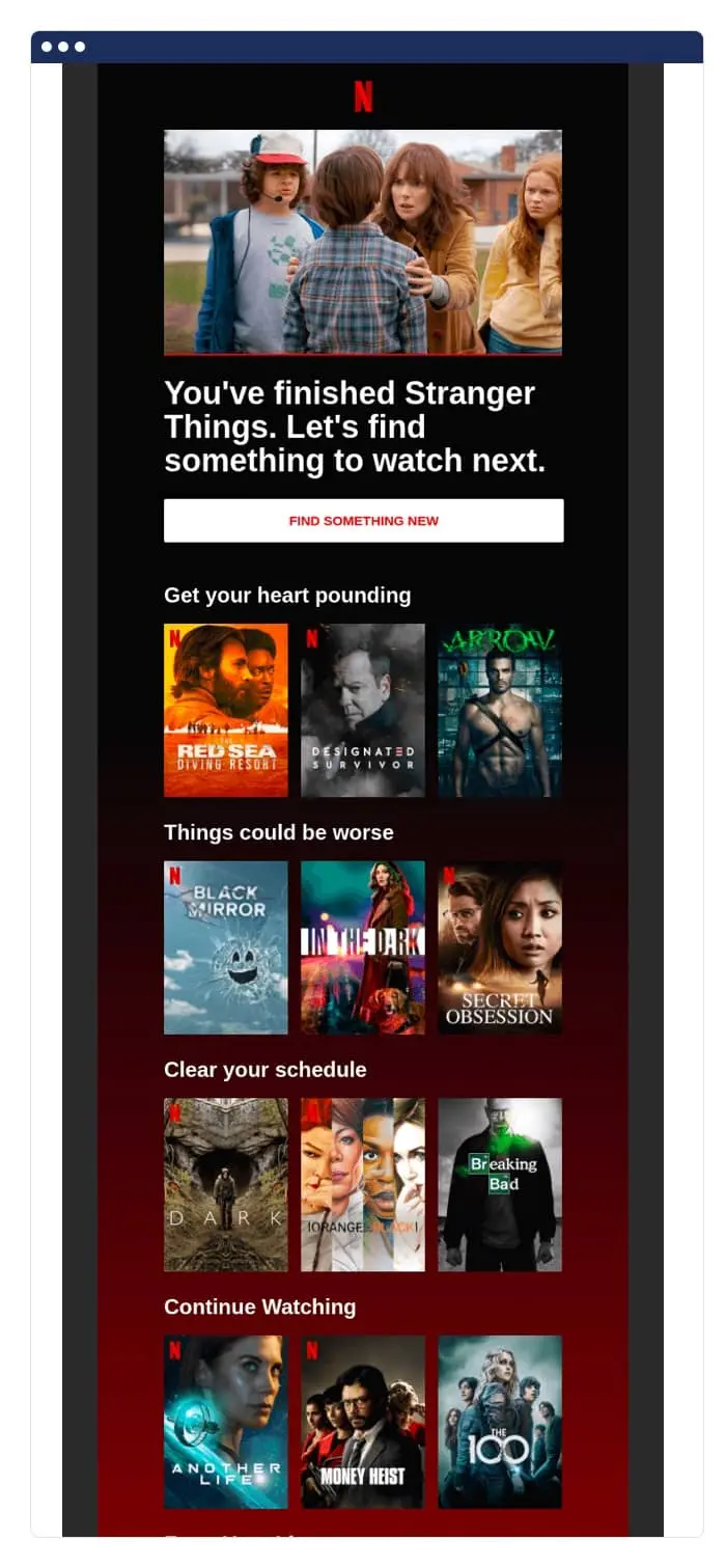 Netflix uses a person’s activity to suggest more content. Don’t have a content streaming service? You can use this email as inspiration to suggest relevant blog content to customers, or highlight some features they may be missing.
