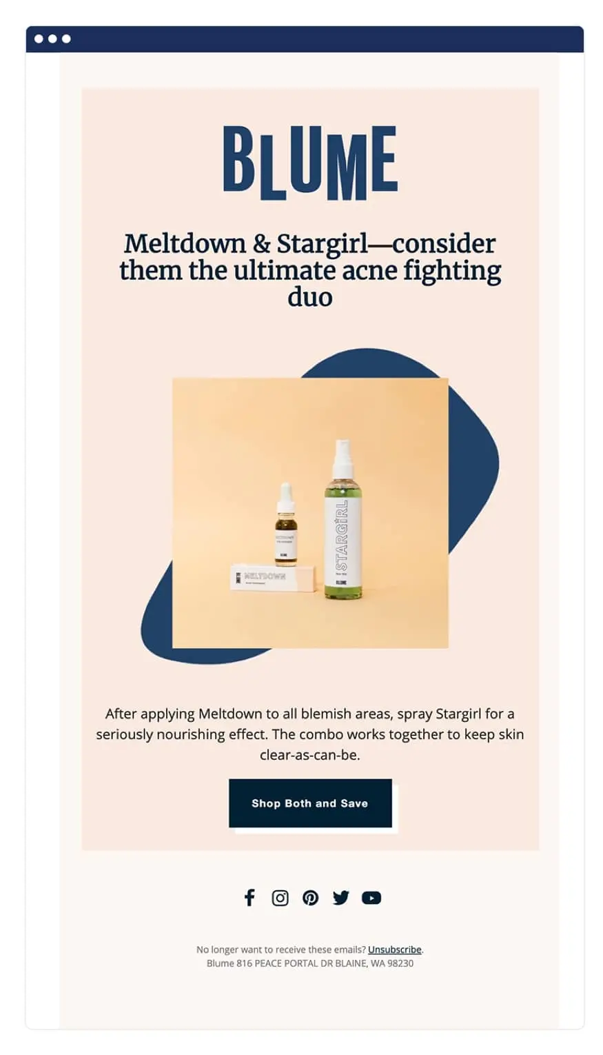 Let’s look at an example where being user-centric can help you analyze email performance. The email below from Blume is promoting two acne-fighting skincare products. While you could monitor CTR and conversions for everyone who received the email, there are some user-centric “filters” you could use in your analysis.