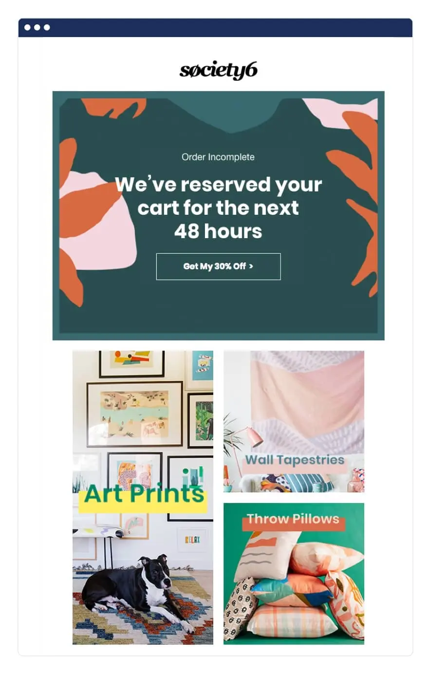 If you send abandoned cart emails, like the one from Society 6 below, it’s worth taking a look at open times. If there’s a trend of customers not opening the email and completing their transactions for three days after leaving your site, you may have better success delaying your automated campaign to match behavior.