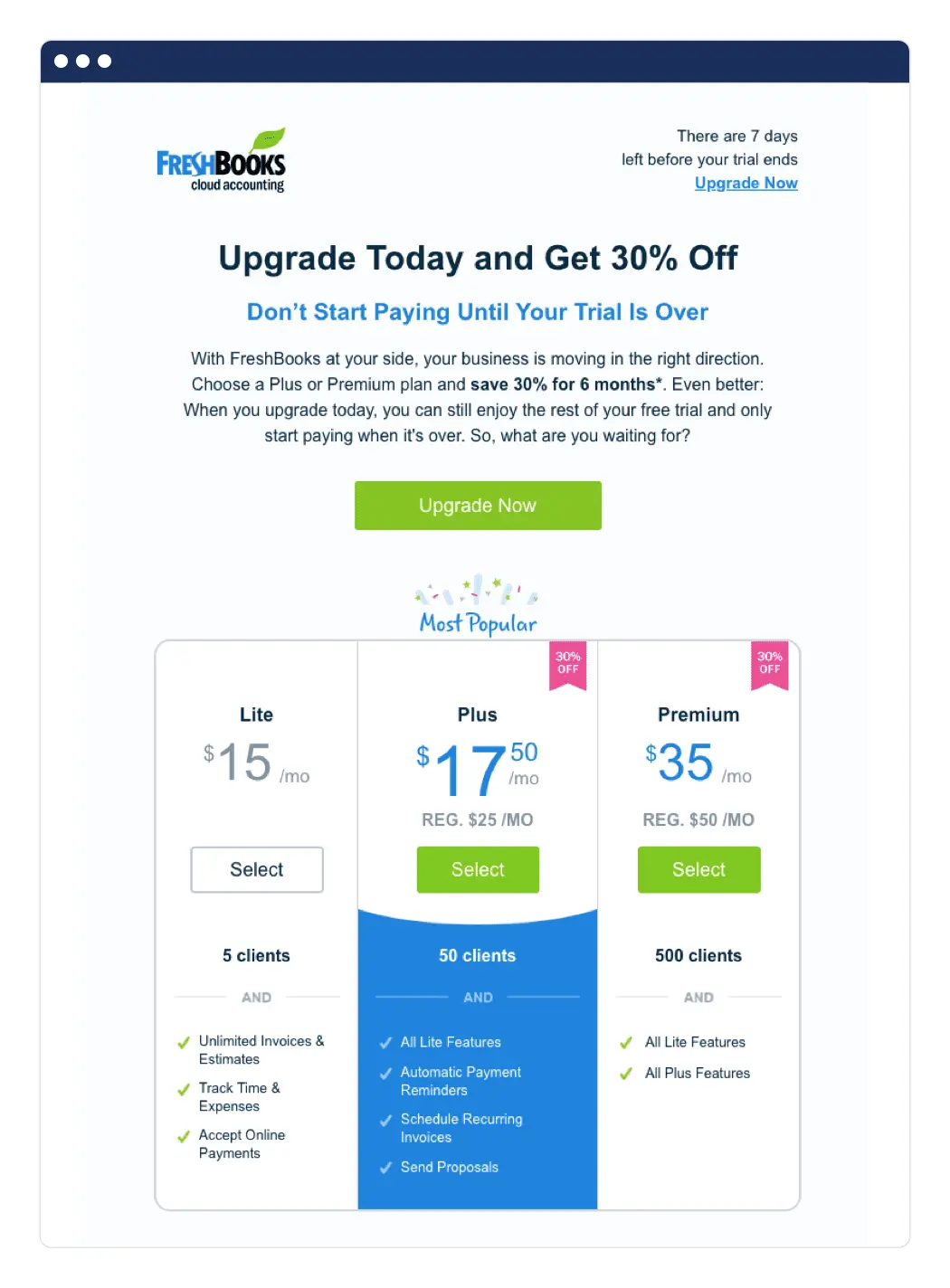 You’ll likely want to send a few calls to action, as FreshBooks does. The first upsell emails may focus on the benefits of your service along with a simple CTA button, or an offer to talk to a customer success team member. Future emails, like the one below, could also mention specific monthly plans or upgrade offers.