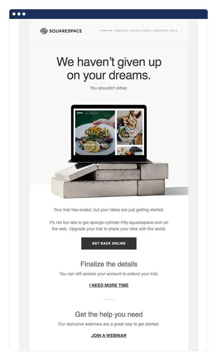 Squarespace uses its winback email to offer assistance or a trial extension. The headline lets users know Squarespace is still ready and willing to help, and the email gives vital information about the fact that the user’s website isn’t live on the web. In addition to an extended trial offer, Squarespace has a webinar to help users with setup.
