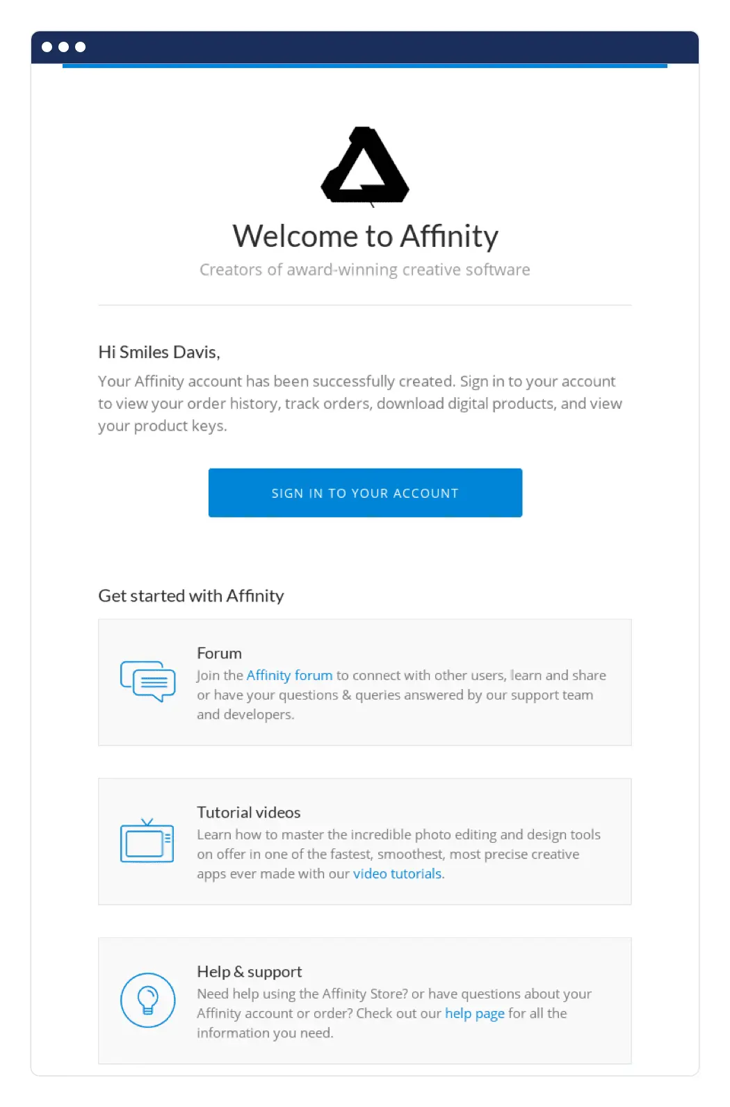 - Always focus on providing value first. You’re here to help users, not just ask them to open their wallets. Talk to users about what they want to learn and achieve, and then create content and highlight tools to fulfill their jobs to be done. Affinity offers up forums to chat with other users, tutorial videos, and help documents.