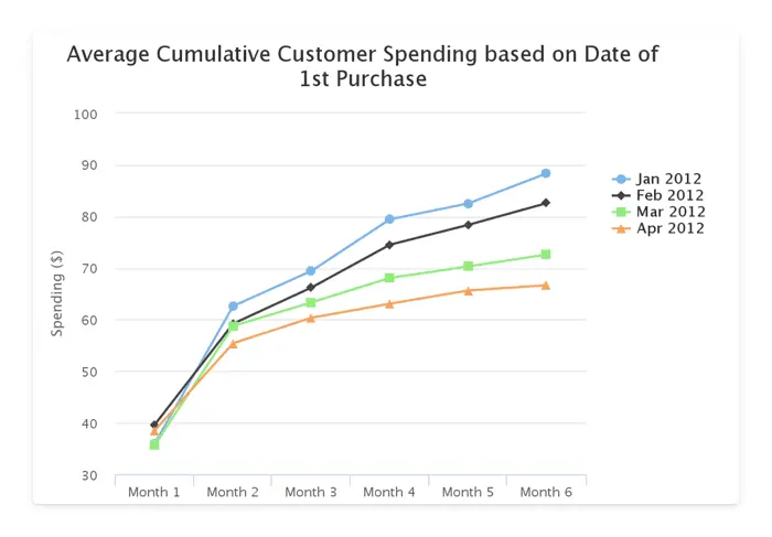 For example, you may group users together by signup date. Comparing how well each group retains or grows based on which iteration of the onboarding sequence you sent gives you an idea of how effective your emails were. In the graph below, they’ve used the date of first purchase to track spending over time.
