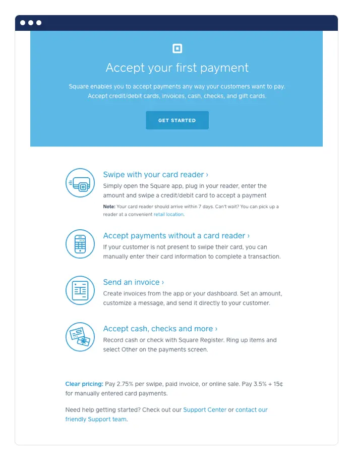 Square’s essential first task is having vendors accept payment, and if a new user hasn’t done so within the first three days, Square sends the reminder email below. The message points out the benefit of Square, which is being able to accept payment in many forms. There’s a clear CTA at the top of the email, plus details about each payment method below.