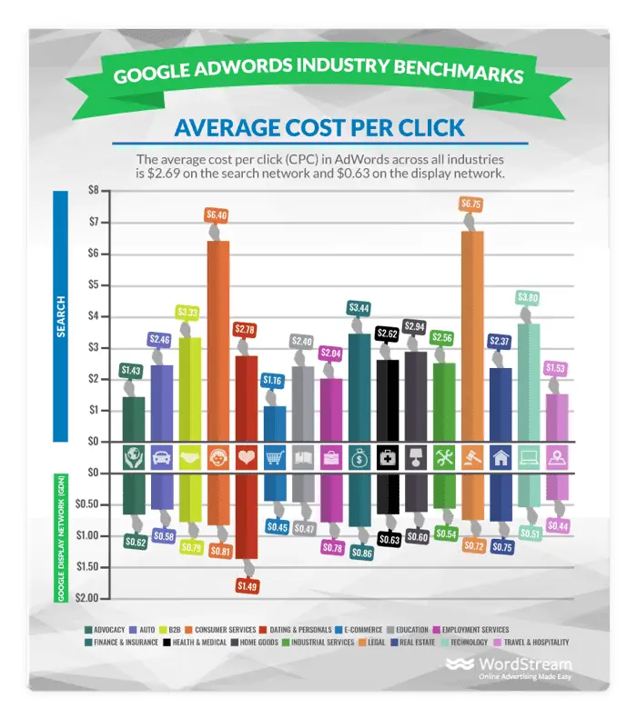 The average Google AdWords cost per click across all industries is $2.69, but it’s always useful to find benchmarks for your niche. Costs also vary by platform, with the average global cost per click on Facebook coming in at just $0.35.
