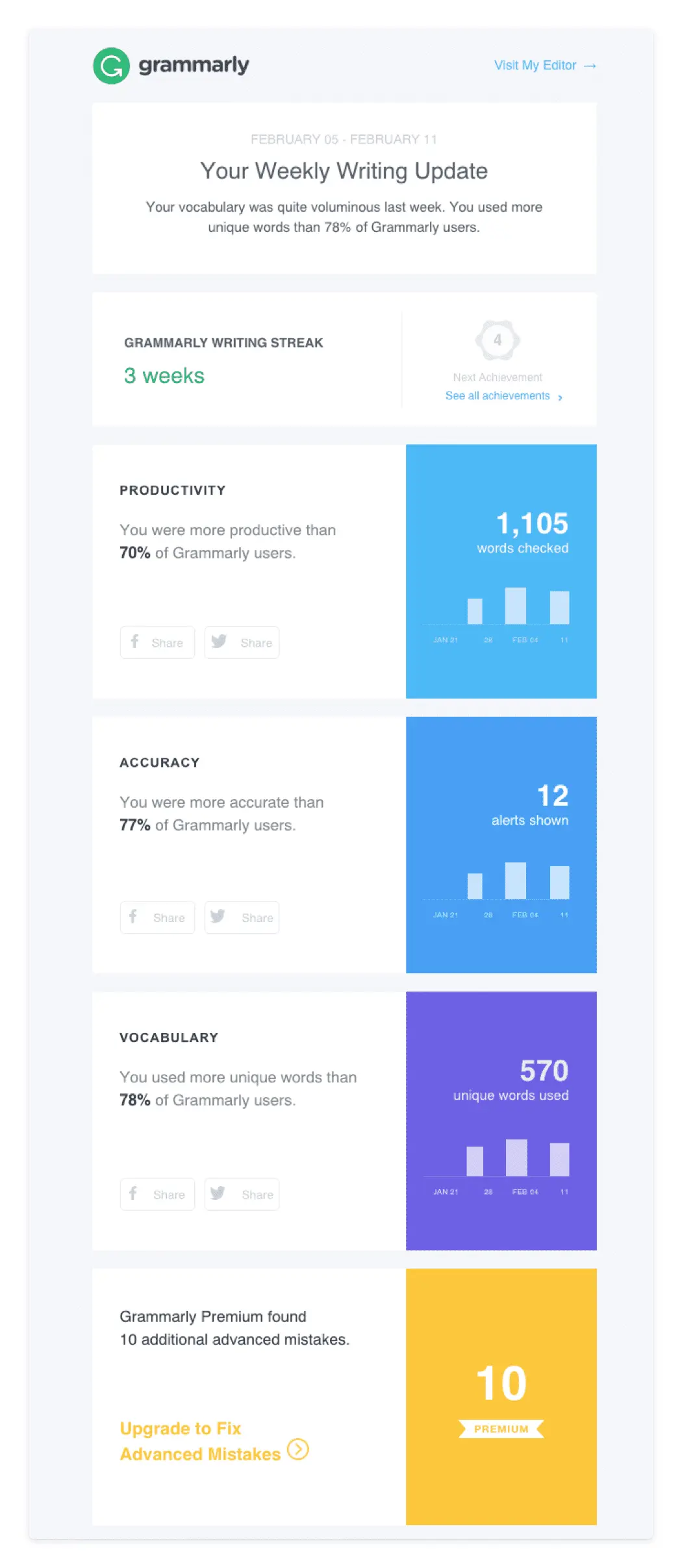 Grammarly is another company that’s good at using data across marketing channels. Their emails are customized each week to writing activity, which allows them to send targeted resources that help users learn and evolve.