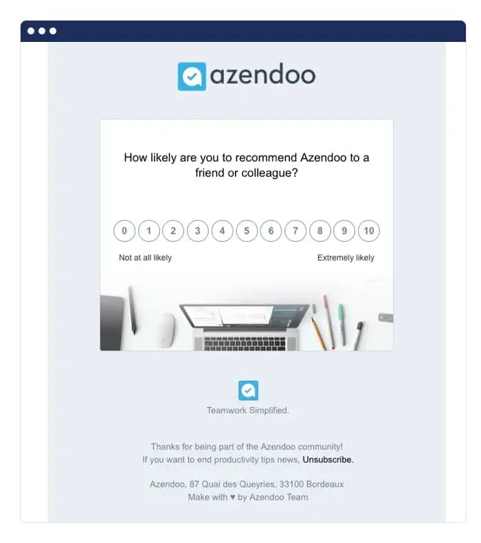 Who should you send a referral email to? Azendoo takes the approach of gauging net promoter scores first. By asking how likely a customer is to recommend the company to a friend or colleague, they can find the users who would be most likely to pass along a referral offer.