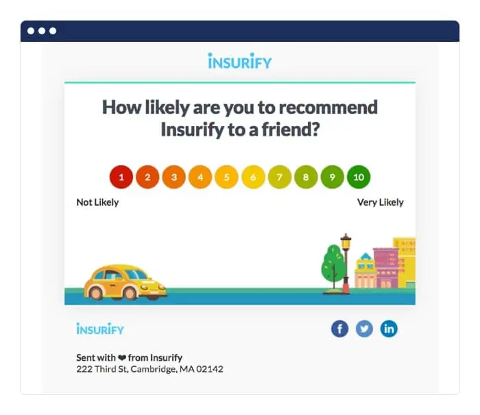 You should also analyze NPS ratings from users after they’ve submitted support tickets. Gauging sentiment after these interactions can let you know whether the issue was truly resolved and the customer is happy. To gather NPS scores, send a simple email like the Insurify example below.