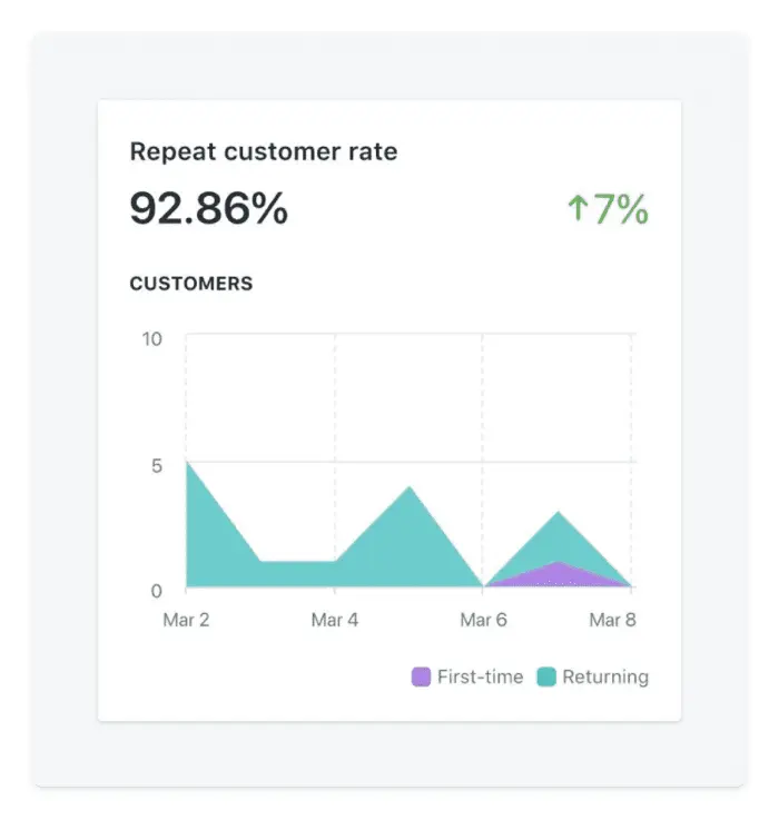 Instead of calculating this rate once and calling it a day, compare the numbers over time, such as in the graphic from Shopify below. How is your month-over-month and year-over-year performance? Does your repeat customer rate vary between product lines or customer segments?