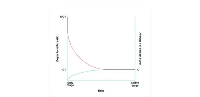 This evolution is displayed in the chart below. In the early stages, buyers bid infrequently, and you may need 100 buyers to every seller. As time goes on and the average number of bids per buyer increases, the ratio of buyers to sellers drops.