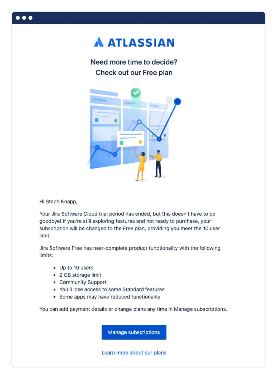 Atlassian sends an email once the free trial has ended, extending an offer to remain on their “free” tier. This tactic lets users “step down” as opposed to leaving entirely, and allows Atlassian to maintain contact in hopes of an upgrade in the future.