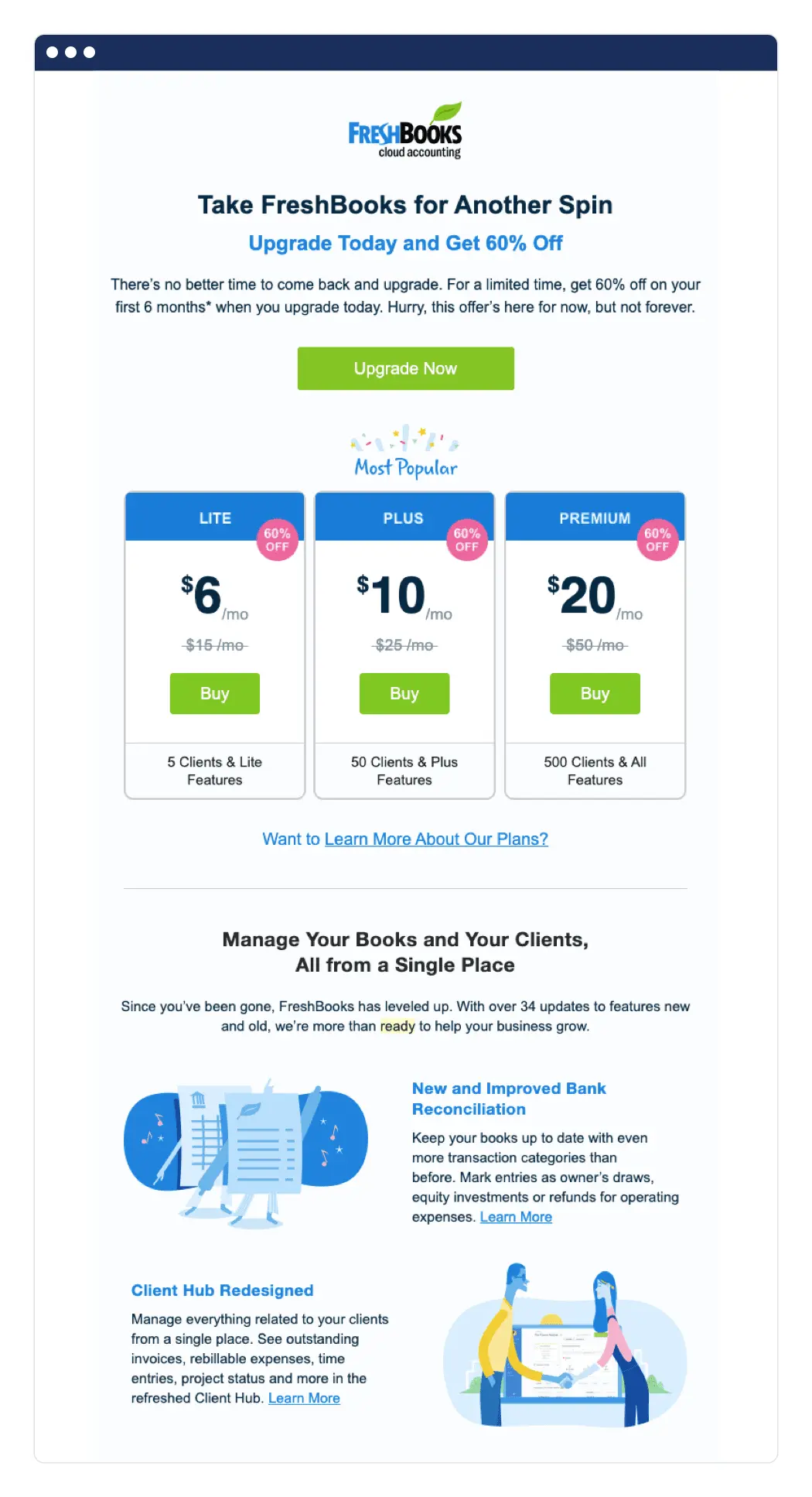 If a customer has canceled their service, you may come back later with an incentive. FreshBooks sends an email with the headline “Take FreshBooks for Another Spin” and introduces a discount if you pre-pay for six months. They also take time to highlight some recent updates.