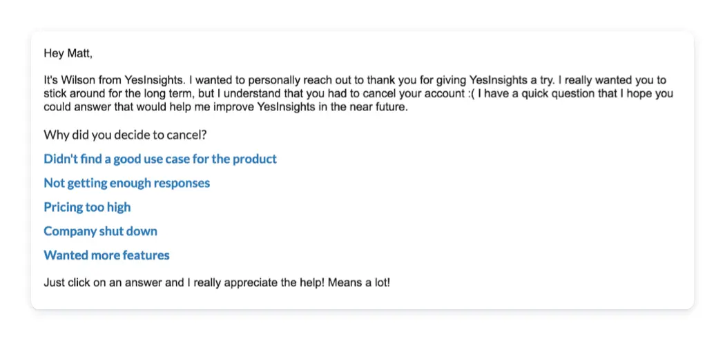 Including a one-question survey on your cancellation page or a feedback email for lapsed users helps you gather data. For example, YesInsights sends a simple text email with five common churn reasons. All a person has to do is click which applies to them, and then YesInsights can compile data on the most pressing issues.
