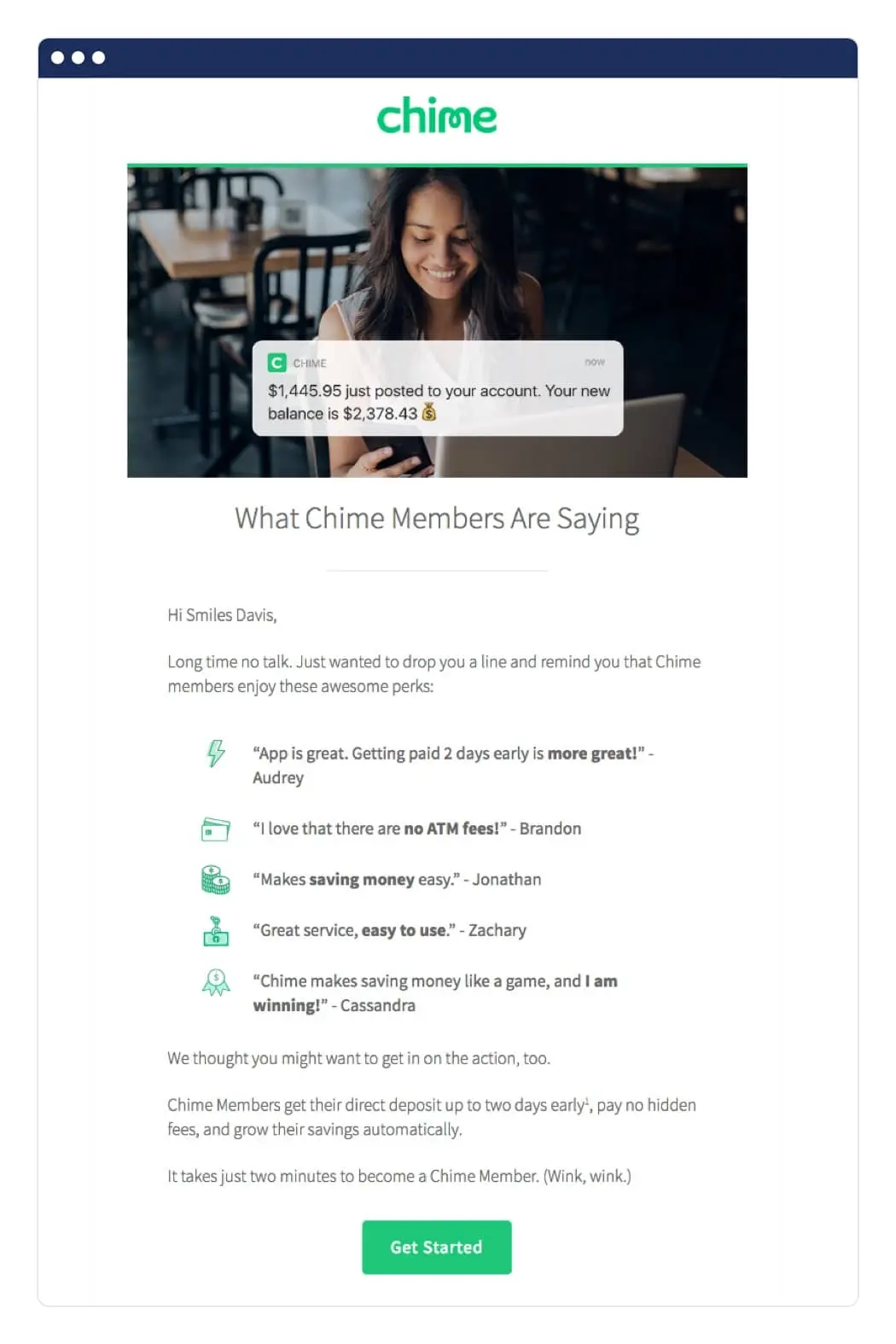 Chime also uses its winback email to address why you should give their company another shot. The email below, which came under the subject line, “What Chime Members Are Saying,” is full of social proof. The core of the email features quotes from chime members that highlight top benefits.