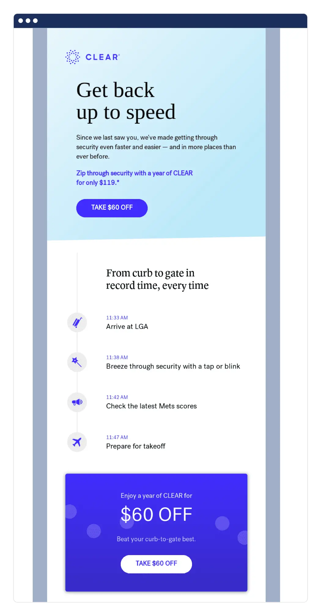 CLEAR also chooses a single benefit to highlight throughout their email. The subject line acknowledges the lapsed time by saying: “[Insert name here], we’re ready to wow you again.” The email also includes the incentive: “Zip through security with a year of CLEAR for only $119.”